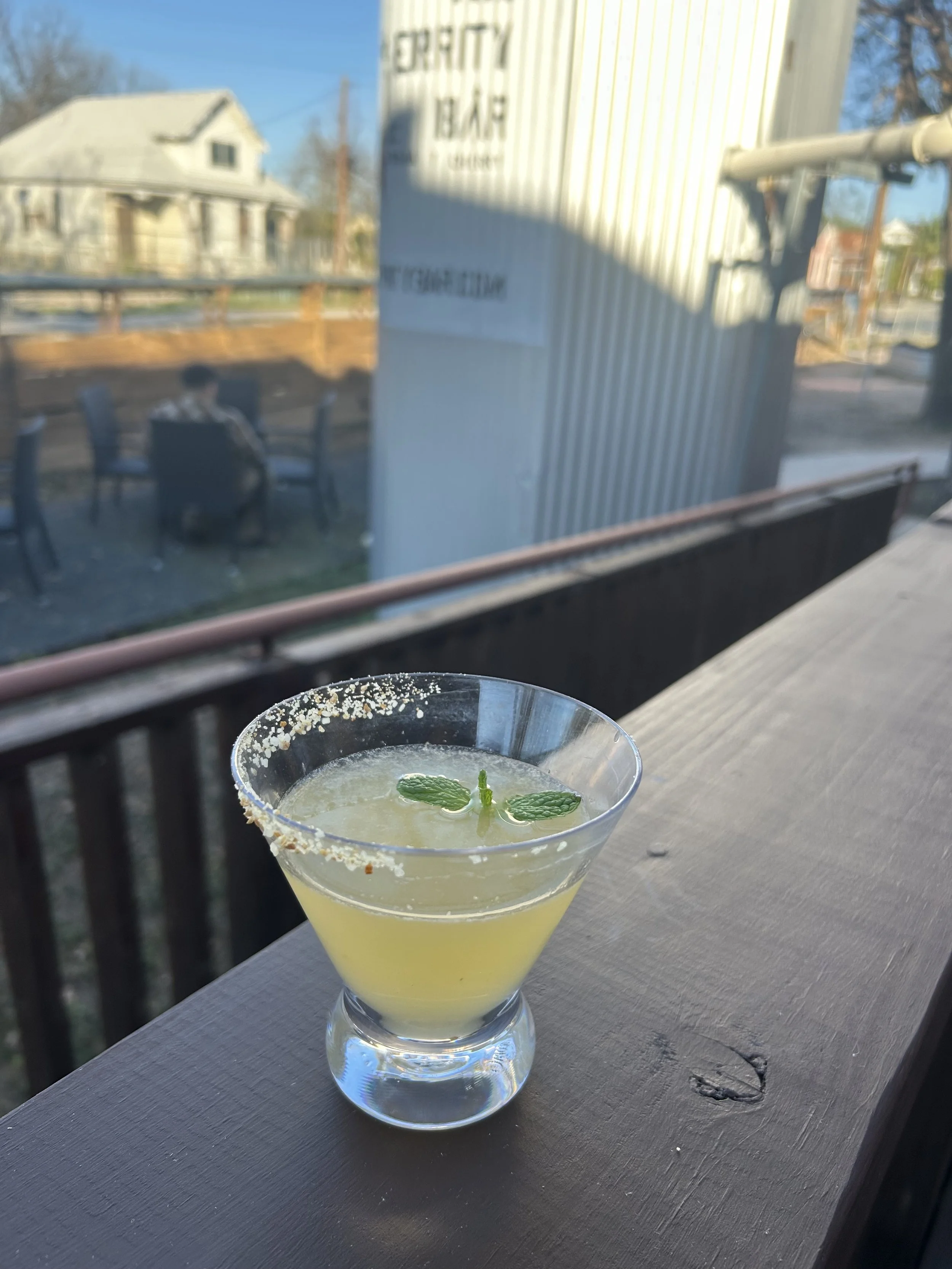 The Spear of the Sun is a mix of house-made spearmint syrup, combined with tangerine and lemon juice, Don Q Rum, topped with a citrus salt rim!